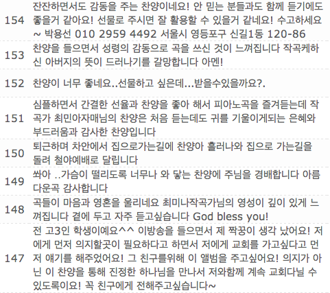 “그때 하나님께서 곡을 만드는 은사를 주셨어요. 제가 배운 음악공부가 발휘되는 시발점이 되었죠. 그후로 8년 동안 오직 하나님만을 찬양하는 곡을 썼어요. 그리고 하나님께서 주신 비전으로 한국 교회, 전세계 디아스포라 교회들과 함께 나누고 싶어 앨범을 선보이게 됐죠. 그리고 가사집도 공개해서 많은 사람들이 하나님이 찬양했으면 좋겠어요.”
